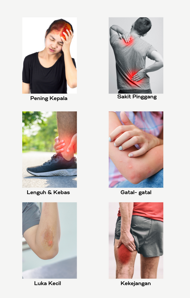Titiskan di permukaan yang sakit/kebas/lenguh dan urut secara perlahan – lahan.